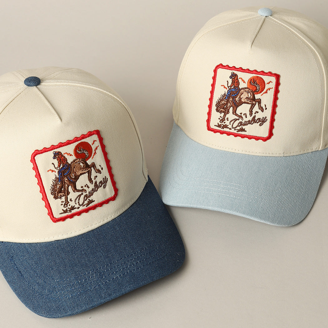 - Detailed Cowboy and horse Image Embroidery Patch - 5 Panel Trucker Baseball Cap - Stylish Two-Tone Denim Cap - 100% Cotton -One size fits most: adjustable snapback closure