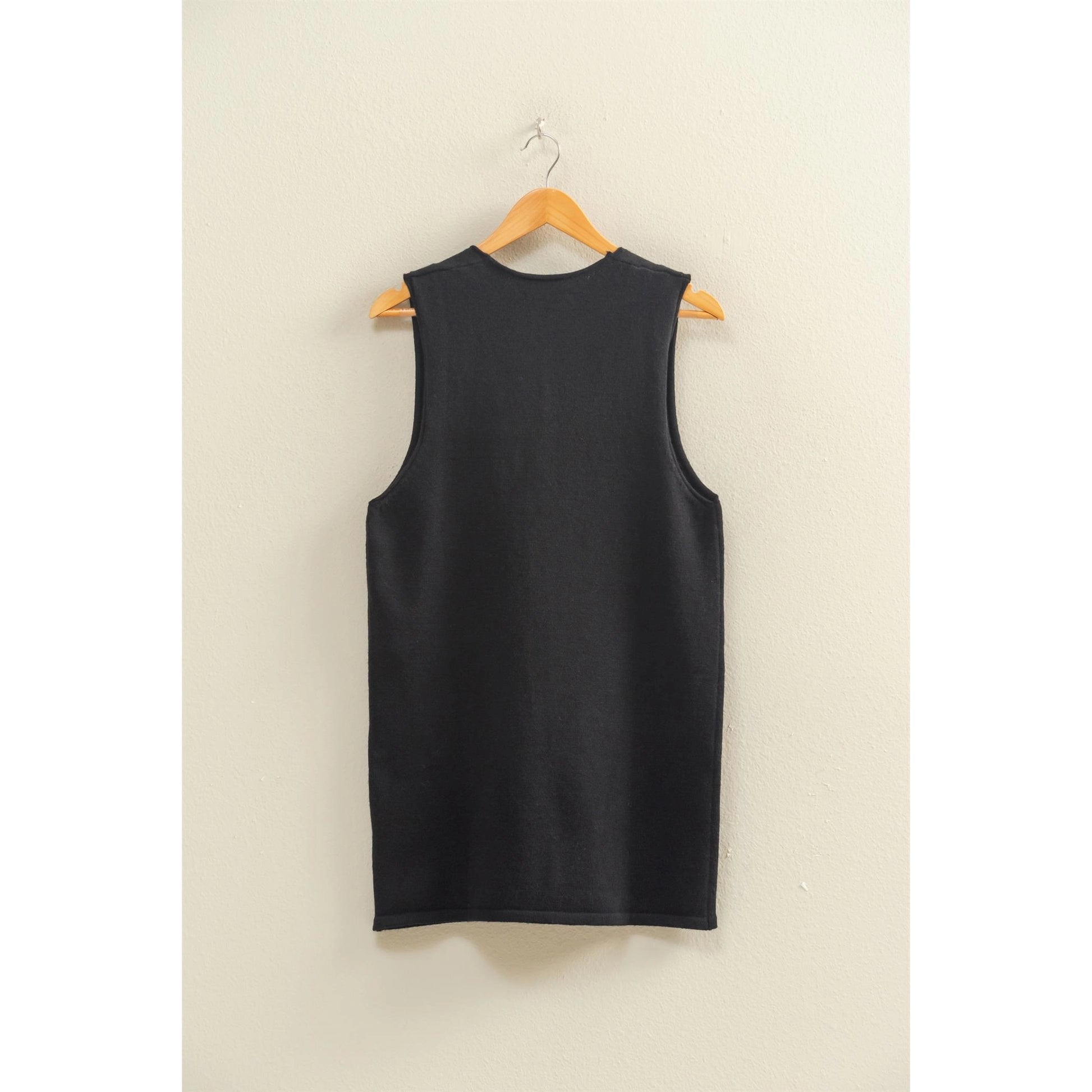 This sleeveless knit mini dress features a deep V-neckline and a relaxed, easy-to-style silhouette. Designed with clean finishing and front patch pockets, it pairs effortlessly with fitted tops or turtlenecks for a layered look. Perfect for fall and winter, its simple lines make it a versatile piece to style stylishly throughout the colder seasons.